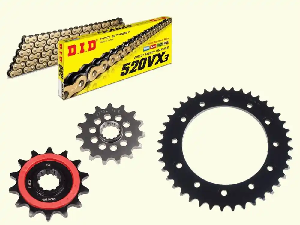 Die Kette ist eine extra verstärkte DID-Kette. DID ist Erstausrüster vieler marktführender Motorradmarken und Motorsportteams.