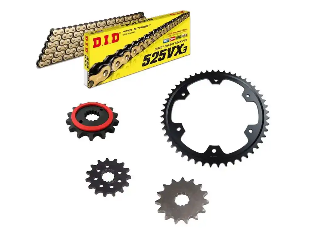 – DID Kette: 525 VX3 X-Ring-DID Kette extra verstärkt (Farbe frei wählbar) – Achtung die VX3 Kette bleibt hinter der ZVMX-Kette zurück – unser Tip: nehmt die ZVMX Kette (haltbarer und zugfester)