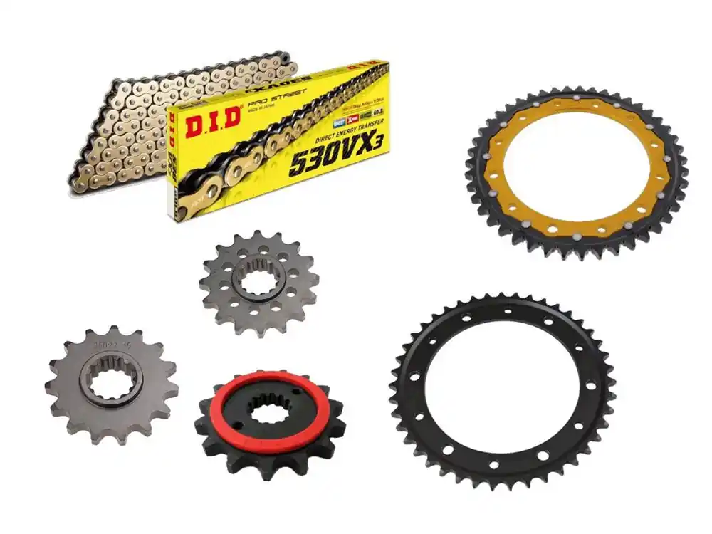 – DID Kette: 530 VX3 Kette extra verstärkt, DID ist weltweiter Nr. 1 Erstausrüster (Achtung: Kettenmax empfiehlt eher die Premiumkette ZVM-X zu verwenden aufgrund der besseren Zugfestigkeit und Laufleistung)