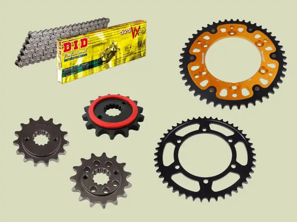 Das Ritzel ist wählbar zwischen einem Supersportritzel mit Erleichterungsbohrungen, einer superstabilen Vollstahlritzel und einem geräuscharmen gummierten Silentritzel. Das Supersportritzel ist mit Erleichterungsbohrungen versehen, was für den entscheidenden Gewichtsvorteil sorgt.