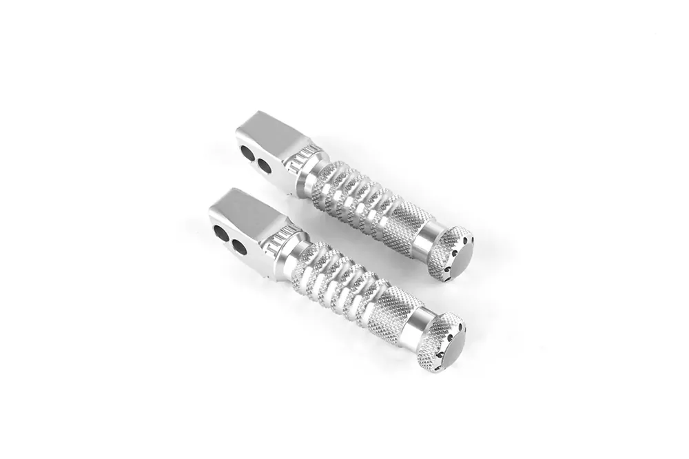 Das Gilles Austauschfußrasten-Kit bietet Ihnen höchste Verarbeitungsqualität und sportliches Design für Ihr Motorrad. Das Set in edlem Silber besteht aus Rasten für Fahrer- und Soziusposition und überzeugt durch eine griffige Oberfläche (Länge 80 mm) für optimalen Halt. Die Montage erfolgt dank der mitgelieferten Klappgelenke einfach und schnell an den originalen Aufnahmepunkten des Motorrads. Das Kit verfügt über eine ABE gemäß Verwendungsliste und kann somit legal im Straßenverkehr verwendet werden.