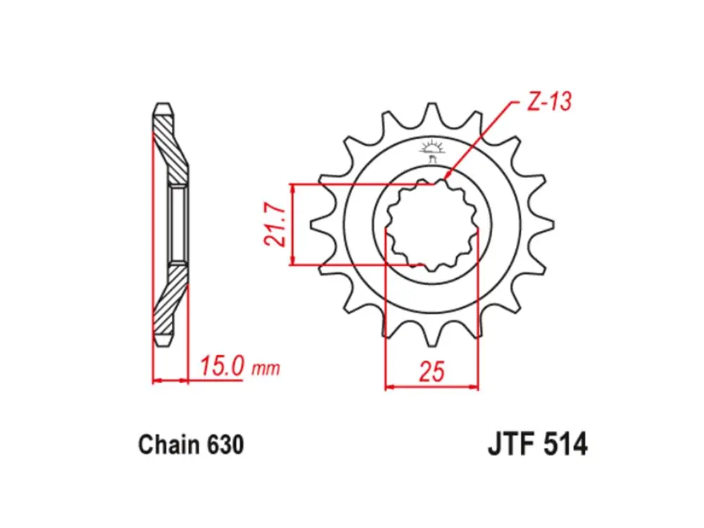 Das Kettenritzel besitzt 15 Zähne mit der Teilung: 630 (für weiter technische Details zum Kettenritzel bitte: Bild vergrössern anklicken)