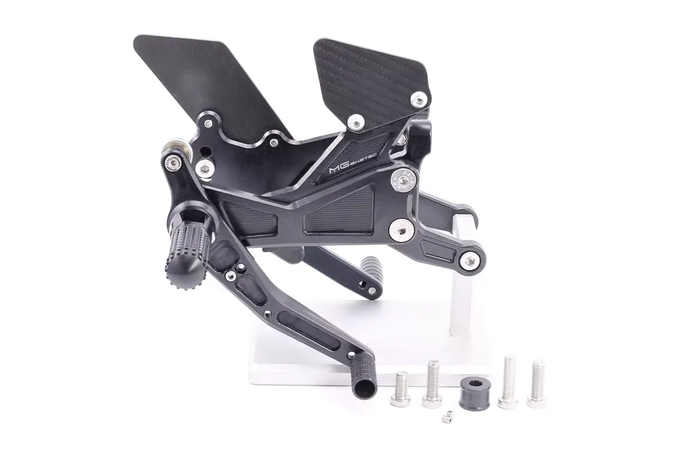 Die MG Biketec Sportfussrastenanlage wurde speziell für den Rennsport entwickelt und bietet höchste Performance sowie ein präzises Fahrgefühl. Sie ist in sechs ergonomischen Positionen verstellbar und ermöglicht eine individuelle Anpassung an Ihre Fahrweise. Gefertigt aus hochfestem, hitzebehandeltem 7075 Aluminium, überzeugt die Anlage durch ihr geringes Gewicht, hohe Stabilität und ausgezeichnete Verarbeitung.