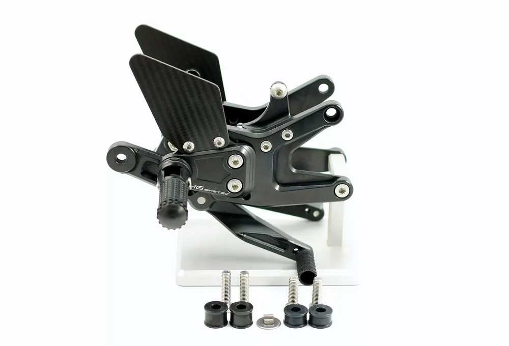 Die spielfreien, doppelt kugelgelagerten Schalt- und Bremshebel ermöglichen exaktes und direktes Schalten, kompatibel mit dem serienmäßigen Quickshifter-System. Verstellbare Fersenrasten (bis zu 20 mm nach oben und hinten) sowie zweifach verstellbare Brems- und Schaltrasten (10 mm) bieten individuelle Anpassungsmöglichkeiten. Die Anlage ist komplett schwarz eloxiert, mit integriertem Halter für den Bremslichtschalter und edlen Carbon-Fersenschützern versehen.