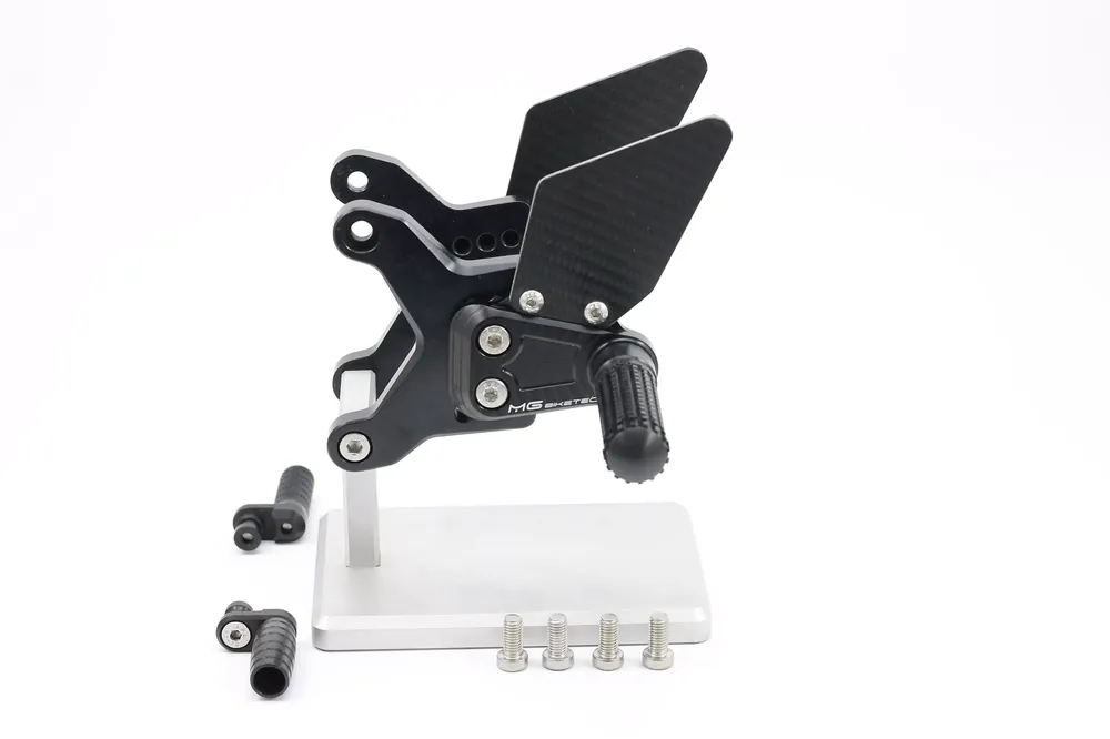 Die MG Biketec Sportfussrastenanlage überzeugt durch ihr präzises Rennsportdesign und ihre robuste Konstruktion. Sie ist vollständig aus hochfestem, CNC-gefrästem 7075 Aluminium gefertigt, hitzebehandelt und schwarz eloxiert für maximale Langlebigkeit. Die Anlage ist ergonomisch in 9 Positionen bis zu 20 mm verstellbar und bietet dabei optimalen Halt, hohe Steifigkeit und ein besonders geringes Gewicht. Das lasergravierte MG Biketec Logo sowie Carbon-Fersenschützer unterstreichen die sportliche Optik und Premium-Qualität. Für maximale Sicherheit und Komfort sind Brems- und Schaltrasten ebenfalls in mehreren Positionen justierbar. Jedes Set wird mit einer TÜV Austria geprüften und von der KBA Deutschland ausgestellten ABE geliefert, welche die Straßenzulassung in Deutschland, Österreich und der Schweiz ermöglicht.