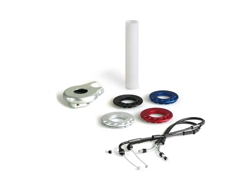 Durch den kürzeren Weg des Drehgriffes und die geringere Reibung bietet der Kurzhubgasgriff mehr Kontrolle und weniger Ermüdung auf der Rennstrecke. Vier verschiedene, farblich gekennzeichnete Übersetzungsverhältnisse lassen dabei keine Wünsche offen. Die passenden Gaszüge für Ihr Motorrad sind ebenfalls dabei.