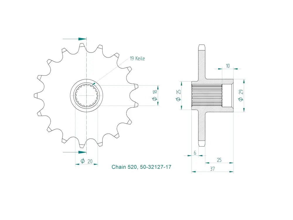 Alle Kettenritzel bestehen aus hochwertig verarbeiteten Stahl und weisen neben der präzisen Verarbeitung eine lange Lebensdauer auf. Das Standardritzel ist ein Vollstahlritzel und ist verfügbar mit folgenden Zähnen: