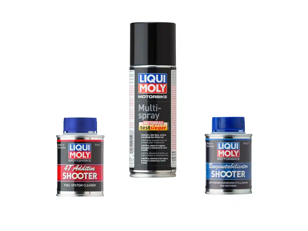 Liqui Moly 3er Set Motorbike Multispray 200ml + Shooter Kraftstoff Reiniger 80ml + Benzinstabilisator 80ml
