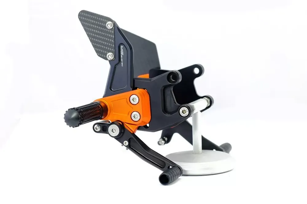 Die MG Biketec Sportfussrastenanlage ist eine hochwertige, rennsporterprobte Lösung, die Ihnen absolute Kontrolle und Ergonomie bietet. Sie ist in 9 Positionen bis zu 20 mm voll verstellbar und aus hochfestem, hitzebehandeltem 7075 Aluminium CNC-gefräst. Diese Anlage gewährleistet maximale Stabilität, geringes Gewicht und optimale Anpassung an Ihre Fahrposition.