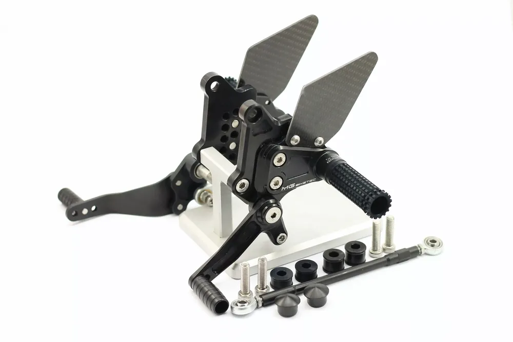 Die schwarz eloxierte Oberfläche mit lasergraviertem MG Biketec Logo und Carbon-Fersenschützern unterstreicht die sportlich-edle Optik. Edelstahlbefestigungen sowie eine spezielle Halterung für den Bremslichtschalter runden das hochwertige Gesamtpaket ab. Die Fußrastenanlage wird komplett vormontiert geliefert und ist mit einer TÜV Austria geprüften und vom KBA Deutschland ausgestellten ABE versehen, gültig in Deutschland, Österreich und der Schweiz.